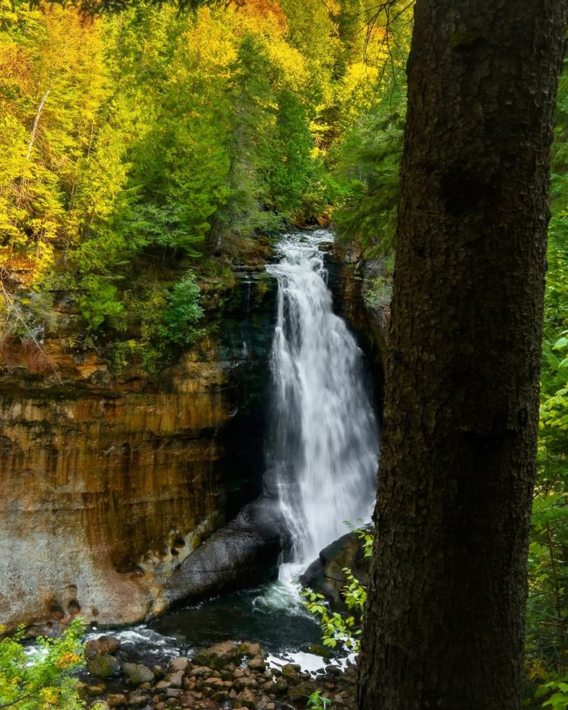 This wonderful 40-foot waterfall is located northeast of Munising. Its water source is Miners River. There is a 1 1/4-mile self-guided interpretive trail that ends at Miners Falls with views of the Miners Basin along the way. There are 77 steps leading down to the viewing platform at the falls where the Miners River cascades some 50 feet over the sandstone outcrop. Please stay on the paved trail. Pets are NOT permitted on this trail.