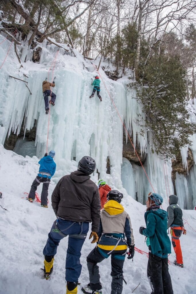 Just outside the Sand Point area, towering sandstone cliffs transform into massive ice curtains each winter. These formations are famous among ice climbers and photographers, with thick columns and draping sheets of ice that can reach 30 to 60 feet tall. The curtains are used each year during the Michigan Ice Fest!